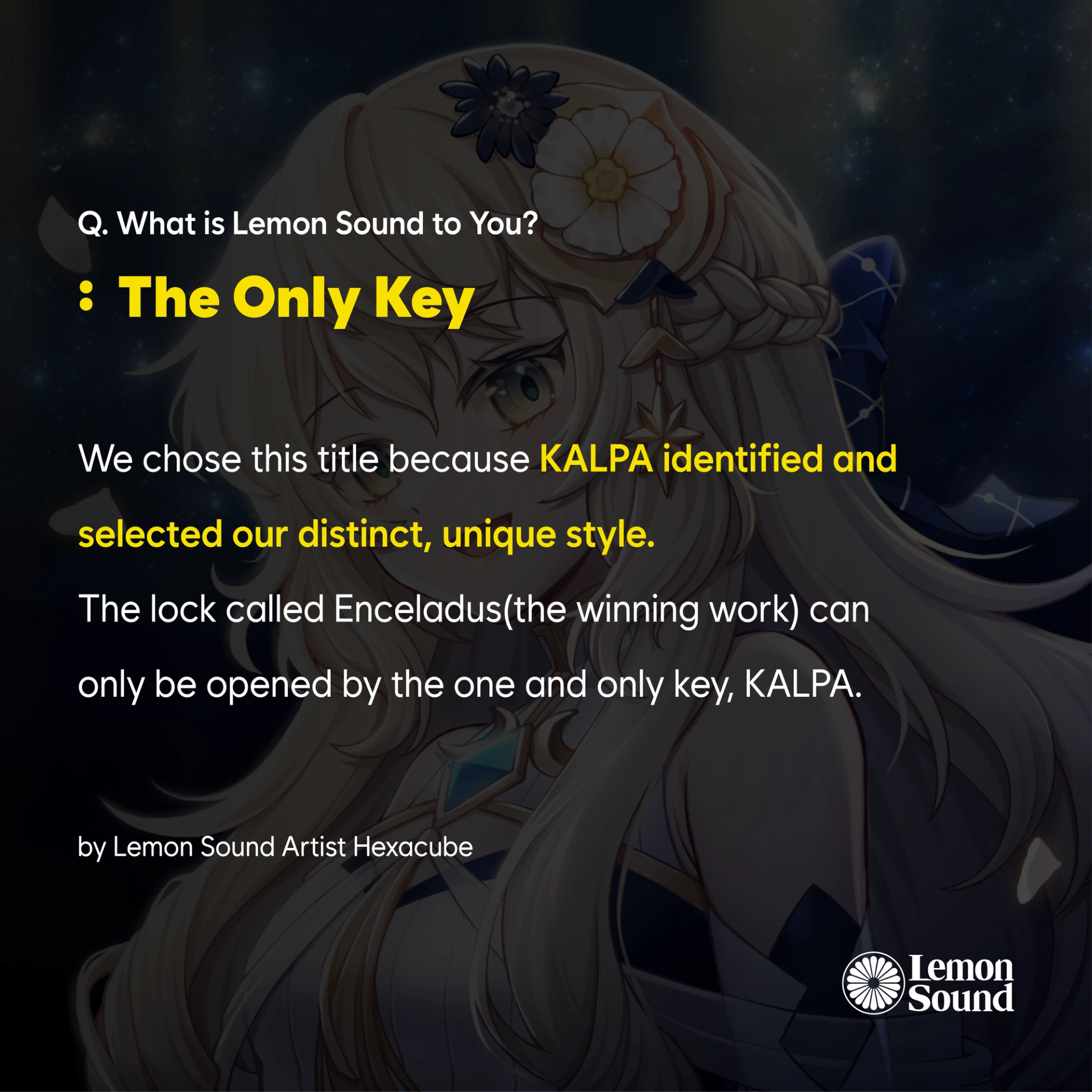 저희들의 색깔이 섞인, 이렇게 특이하고 고유한 곡을 딱 알아보시고 골라주셨다는 의미에서 이렇게 정의하였습니다! Enceladus라는 자물쇠는 KALPA라는 단 하나의 열쇠만이 풀 수 있는 것이죠.